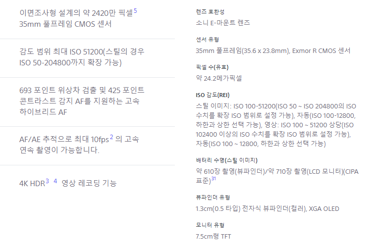 하지만, A7M3 은 구성품이 모자란 단점 따위는 잊게 해 줄 만큼 가격 대비 정말 준수한 퍼포먼스를 가진 풀프레임 바디입니다. 아래는 A7M3의 제원입니다.