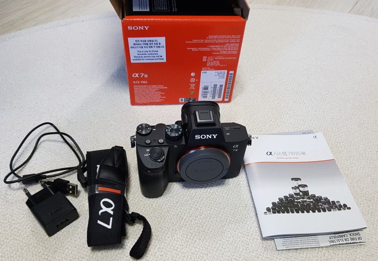 A7M3 Body, 설명서, 카메라 어깨 끈, 배터리, 전원 콘센트 및 충전 케이블 ( 5핀 타입, C-type 아닙니다!! )