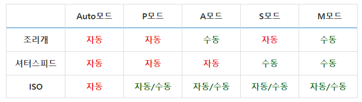 Auto 모드는 조리개, 셔터스피드, ISO가 모두 자동입니다. 그렇기 때문에 세밀한 촬영이 어렵습니다. 따라서 용도에 맞는 촬영을 하기 위해서는 수동 촬영 모드가 필수적입니다.