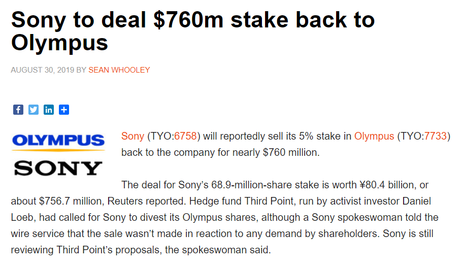 이 일이 있은 이후로 올림푸스의 주가는 60%나 하락하였습니다. 2011년 11월 상장 폐지를 검토하였으나, 소니가 올림푸스의 주식 약 6억 달러를 매입하여 올림푸스를 살려냅니다. 소니는 자본 제휴를 통해 의료기기 분야의 경쟁력 강화를 꾀합니다. 실례로 올림푸스는 그 당시 내시경 장비 점유율 70%를 차지하고 있었습니다.