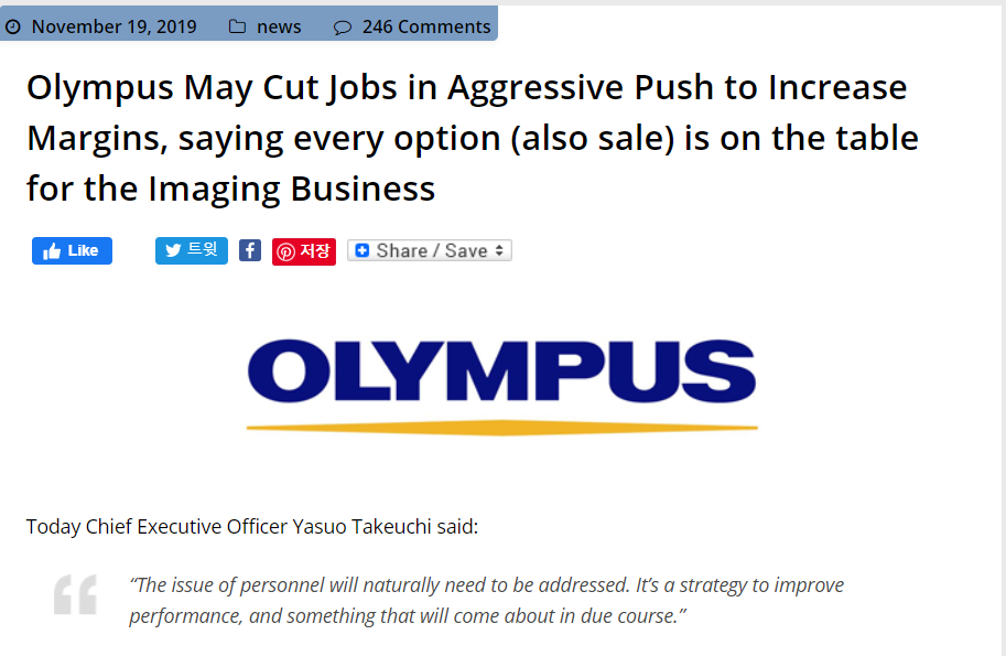 결국은 올림푸스 카메라 사업부의 실적 악화로 인해 직원 고용까지 불안해지는 상황에 이르렀습니다. 2018년부터는 업계에서 카메라 사업부를 매각한다는 소문이 돌기 시작했고, 심지어 CEO도 사업부를 매각한다고 발표했다가 아니다 라고 철회하는 혼란스러운 모습을 보여주고 있습니다.