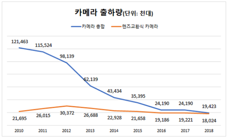 전 세계 정통 카메라 시장은 스마트폰의 고성능화로 인해 많은 어려움에 처해있습니다. 특히 콤팩트 카메라의 경우에는 스마트폰 카메라 성능과 비교했을 때 크게 우위에 있지 않기 때문에 판매량이 근 10년간 급감하였습니다.
