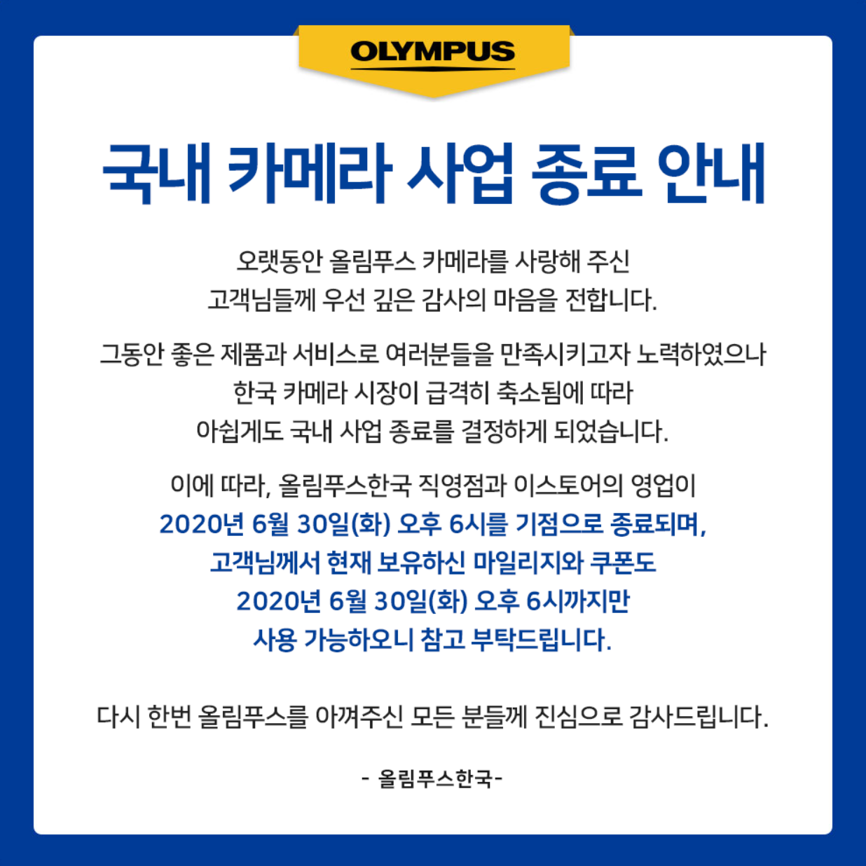 지난 5월 20일 올림푸스 카메라 사업부가 2020년 6월 30일 부로 한국에서 철수한다는 소식을 발표했습니다.